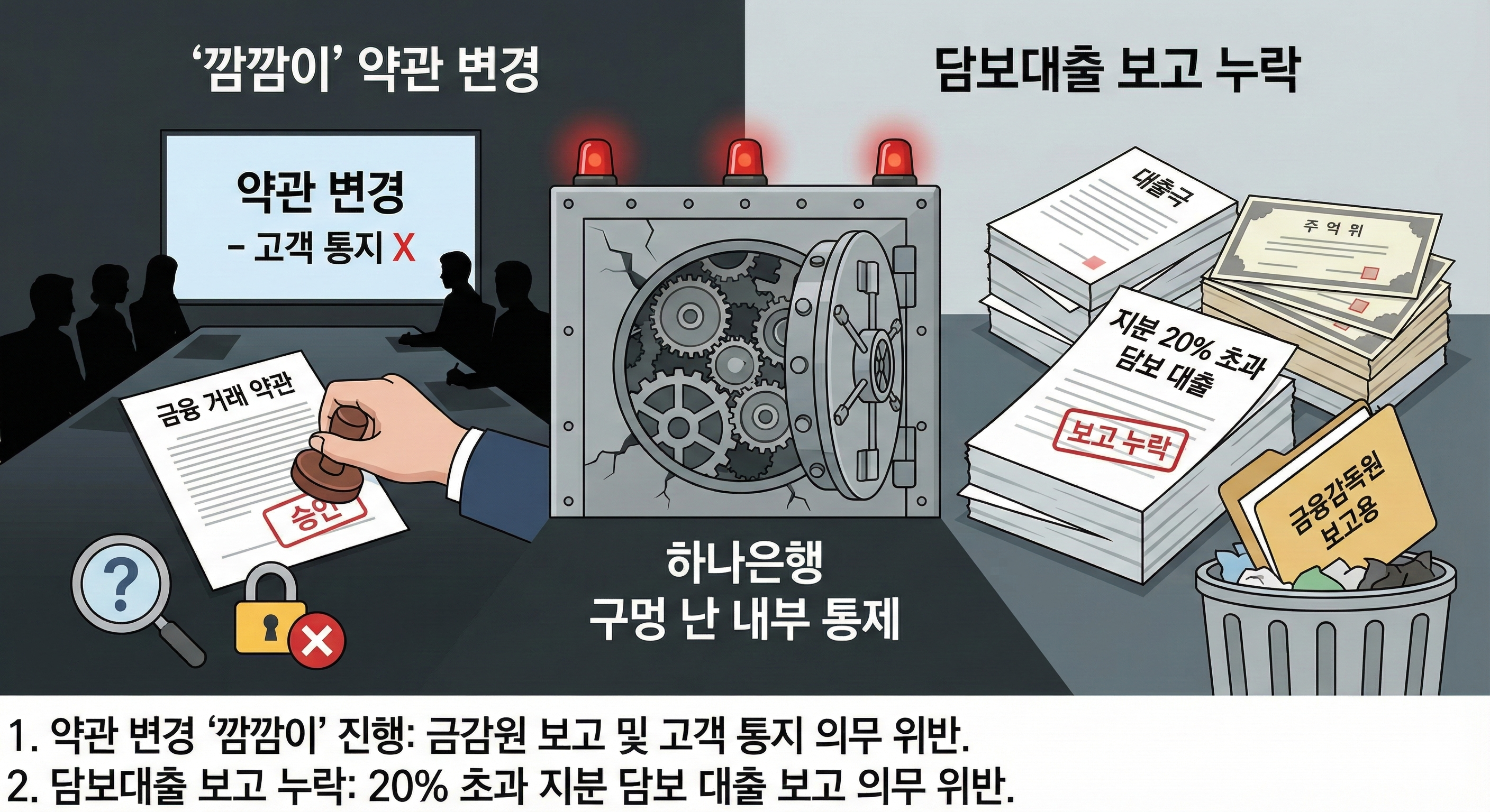 1. 약관 변경'깜깜이'진행:금융 거래 약관을 바꿀 때는 미리 금감원에 보고하고 고객에게 알려야(통지) 하는데, 이를 지키지 않았습니다. 고객 몰래 룰을 바꾼 셈입니다.