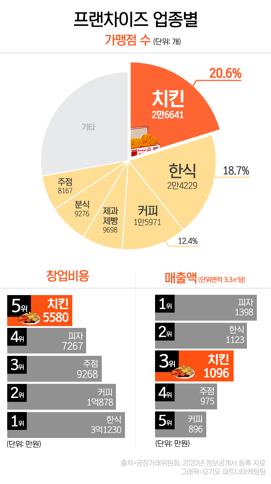 치킨 프랜차이즈는 전체 외식업계에서 20.6%를 차지하고 있으며, 이는 치킨이 얼마나 인기 있는 음식인지 보여주는 지표에요.